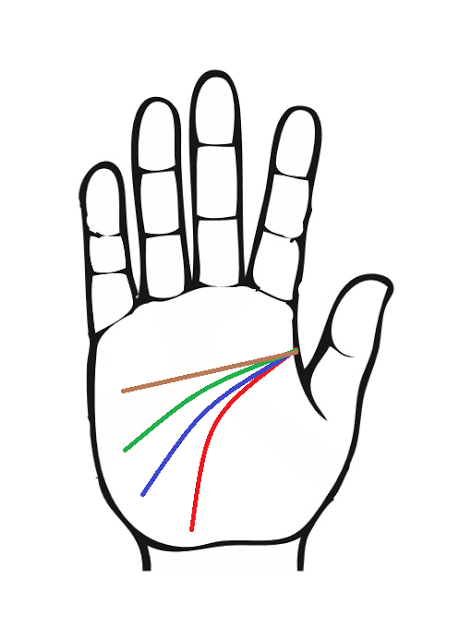 手相の画像には4種類の知能線が描かれています。見るポイントはどこで線が止まっているかです。