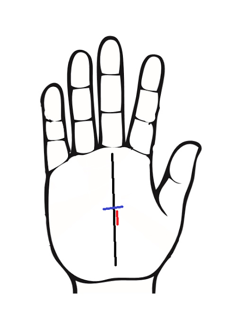 手首が起点になるので半分にあたる青い線より下にパートナー線があれば、30歳前に結婚すると判断します。青い線より上にあれば結婚は30歳以降になります。